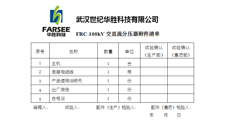 分壓器(千伏表)是高電壓試驗(yàn)中必備的測量設(shè)備,它能將高電壓轉(zhuǎn)換為可用普通電壓表測量的安全低電壓,其測量準(zhǔn)確性、直觀性及使用方便性是傳統(tǒng)測量高電壓采用的靜電電壓表、測量球隙等所無法比擬的。華勝FRC系列高電壓分壓器(千伏表)測量準(zhǔn)確、使用方便安全,符合國家新頒布電力行業(yè)標(biāo)準(zhǔn)《高電壓分壓器測量系統(tǒng)通用技術(shù)條件 DL/T 846.1—2004》要求。