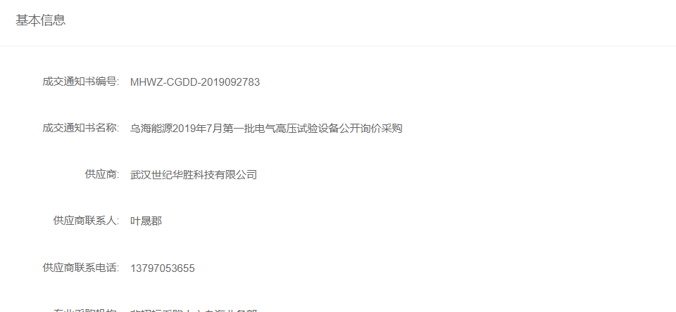 熱烈祝賀:武漢世紀華勝公司國家能源集團烏海能源2019年7月第一批電氣高壓試驗設備公開詢價采購中中標
